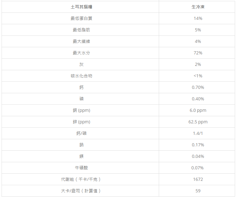 貓糧使用雞、鴨、兔和火雞肌肉、內臟肉和天然生碎骨;魚、鱒魚、白魚貓糧只使用魚和磨碎的骨頭。