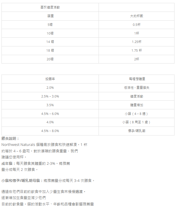 貓糧使用雞、鴨、兔和火雞肌肉、內臟肉和天然生碎骨;魚、鱒魚、白魚貓糧只使用魚和磨碎的骨頭。