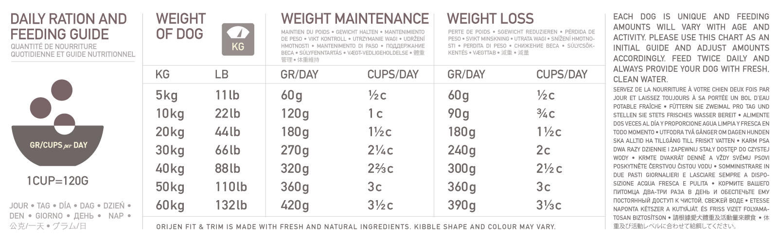 Orijen的乾糧配方符合生物學性,擁有完整獵食肉類比例,最重要是只有1種添加物-鋅,大自然中是沒有任何合成添加物的,野狗野狼都得從完整的獵物身上得到足夠的營養。Orijen將黃金比例的鮮肉結合內臟及軟骨,模擬大自然飲食。